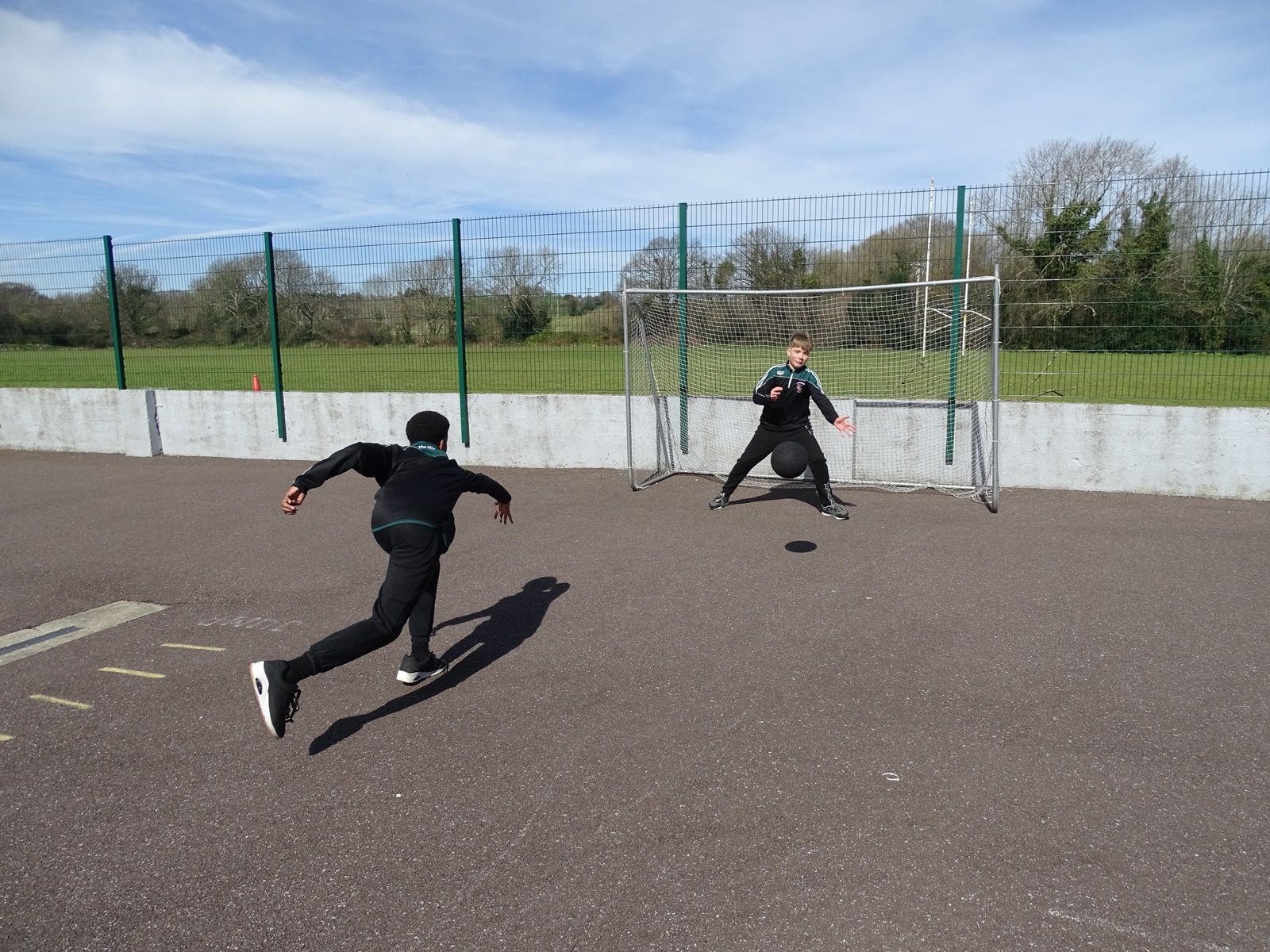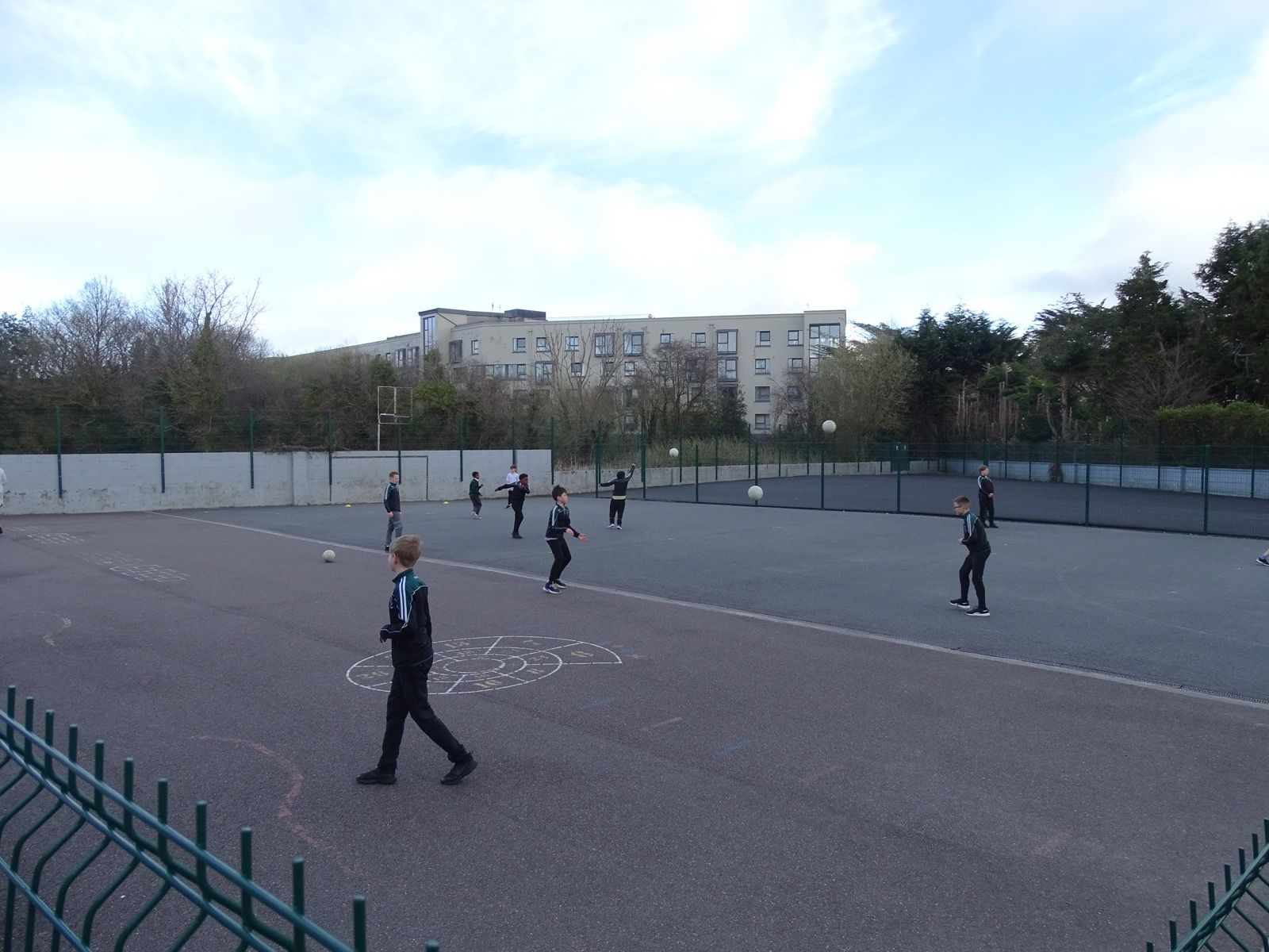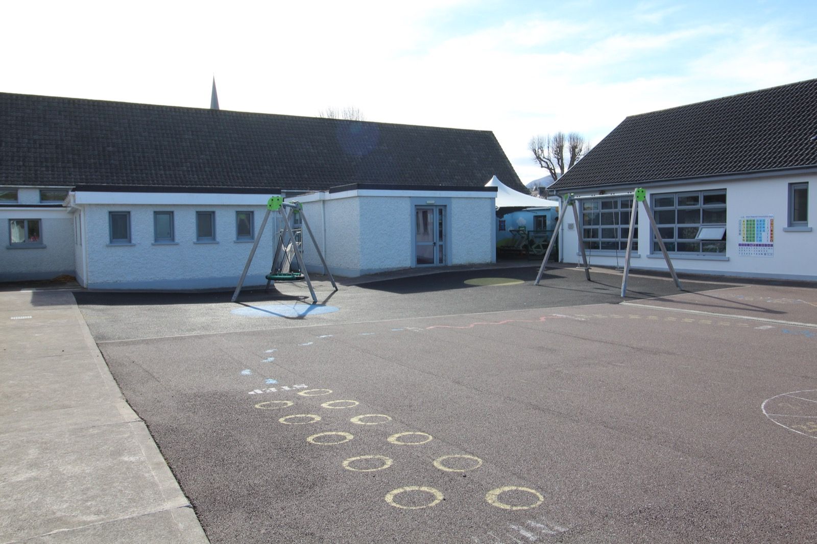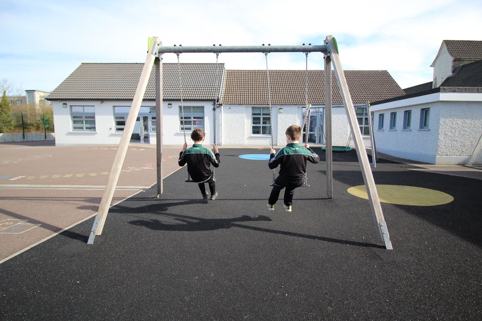 Outdoor play areas featuring a basketball court, soft play surface with swings, and spacious tarmac yards